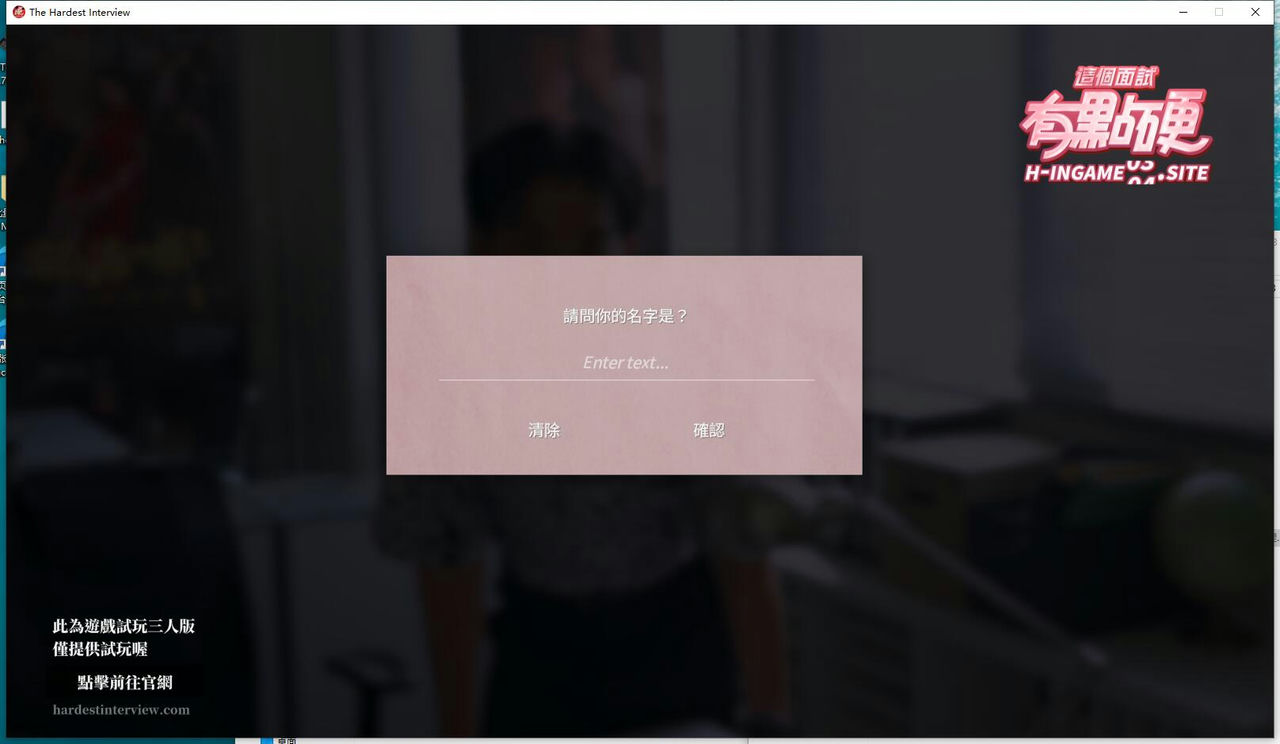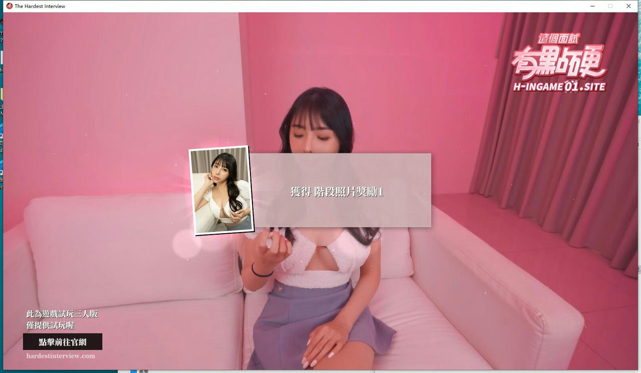 通过两小时的体验,感觉要是只把《这个面试有点硬》当个普通H游,不功不过,游戏性较低,除了开头部分,剧本等于没有场景,全部都是在同一间粉色小屋,游戏过程全程复制粘贴的公式化采访,玩家只要点点点就行;演员虽然仪态上较专业,但演出几乎为零。